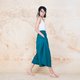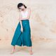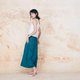 扣子缝合处可依喜好自行更改位置,呈现出的感觉都会有所不同,一颗钮扣的位置,就足以改变整件裤子的风貌。低斜在腹际,为裤裙带来一种俐落的率性;动点巧思移至腰际,则变成了一片裙。让穿着者也参与设计,每个人的生活方式,都能让衣物获得不同的生命。