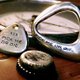 吉他手利用pick弹奏出优美的旋律,pick有各种不同的颜色和图案,