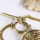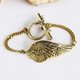 Inspiration from bird wings, the symbol of freedom. This bracelet features a single bird wing with beauty carving details of bird feather. The wing comes in golden tone of brass, and is bend the shape to fit with wrist. End with gorgeous toggle clasp which has details of wine leaf, bird and branch.