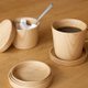高桥工艺所产的木制食具,皆采用整块原木制作无拼接 (杯体为完整原木,把手为相同木材接合),在木材的要求上也变得更加严格,木材幅宽直径,湿度的掌控,木纹的要求,只有精心筛选后的木材,才能用来制作完美的食器。(制造过程可参考设计志)