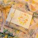 由水彩绘画出许多黄色的花朵,像是太阳花、康沃尔水仙花、柠檬、黄色的鸟儿与蜜蜂们