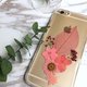 【1】手机壳是全透明包四边的软壳,手机壳表面会灌一层宝石胶把花材封起来,花材最终会相嵌在中央,所以不用担心会掉落问题。有些花朵比较厚或有重叠之处,有可能轻微凸起摸得到(例如:雏菊蕊/飞燕花蕊/满天星)