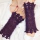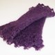 The fingerless lace wrist warmers are hand-knitted from magnificent super soft kid silk mohair in eggplant purple. Exquisite crochet lace in both ends lends them a fairy-like air. The bottom edging of the fingerless gloves is embellished with tiny Bohemian crystals.