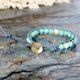 配戴“希望之石”的天河石,能降低负面情绪的产生,据说也有幸运及偏财的能量,容易得贵人相助。来自大海中的金丝砗磲能稳定情绪、去除杂念、增加智慧。