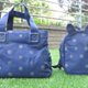 三层侧背包分别有黑底红白点和蓝底黑灰点两色 分别有同色兔兔背包可搭配成亲子包
