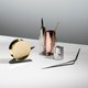 为了让胶台稳定不晃动且可单手使用,此设计构造上的金属质量极高,但透过镜面圆盘内缩曲线的巧妙设计,视觉上却轻盈无比,营造出高反差的对比巧思。特别是圆盘微妙的内凹曲面在抛光工艺上可说是极大的挑战,于设计团队的坚持下耗时九个月开发,终于呈现出毫无妥协的设计。