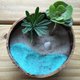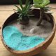 5.diy时,先将发泡炼石放置于椰壳中,再将土放入,再将植物连土一起拔出放入,调整使椰壳内土面平整,再先放白海沙并铺平,再放蓝色彩砂于前端如图,就完成了