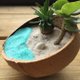 商品故事:椰子壳中的迷你海滩,用夏威夷的圆叶古木等植物来呈现热带风情海滩上的椰子树,让在办公室的你,也可感受到对海岛旅游的回忆。