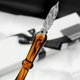 玻璃笔(日文:ガラスペン),又称之为威尼斯玻璃笔,是一种藉笔头上的毛细槽来贮墨、同时引导到笔尖的特殊书写装置(吸虹原理)。我们贩售的定制玻璃笔需同时两位设计师才能完成作品,制作玻璃笔须为经验深厚的师傅才能烧出,玻璃笔的笔头需要加热扭转出特殊角度才能用毛细作用将墨水吸至笔头里是很精密的技巧结合完美的笔身曲线与色彩,再加上资历需6年以上的玻璃雕刻设计师加工精致手绘雕刻,将客户的心意加以沟通诠释在作品上,一件完美的礼物才能完成!
