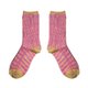 去年夏天,五光十色的职人渲染席卷了袜子控们,延续概念,今年又出现了新的手感设计。这款袜儿是在纱线上做了主色和花纱的交错拈织,每条纱线除了有细细的花点儿,更有丰富渐层的颜色,所以每一双袜儿虽有它主要的色调,但仔细看却有细腻的渐层变化,前所未有的细腻和创意!!!有时是斜纹,有时是横条纹,更有时候是不规则散落却好迷人。不刻意控制的织做,甚至两脚穿上却都有微妙的色彩变化,我非常诚实的要说他好看死了。