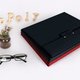正面合盖片上系列LOGO压印和古铜铆钉设计。