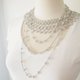 细致且华丽的复古宫庭风蕾丝项链。该款商品由串珠蕾丝技法所制成,珠材采用日本玻璃小珠,复杂巧妙的蕾丝钩法与晶莹绚丽的玻璃小珠,仅为了表现宫庭珠宝的墔灿与非凡。此款蕾丝项链是搭配宴会礼服的绝佳选择,但若与质感好的美型牛仔裤混搭,也可穿出独具风格的装扮。