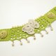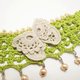 迷人且浪漫的蕾丝手环,此手环系以爱尔兰手钩蕾丝与串珠蕾丝的技法制作,淡水珍珠与日本玻璃小珠映衬出此作品的雅致。爱尔兰蕾丝与串珠蕾丝的结合,使此作品呈现出既立体、精致又典雅的丰富样貌。