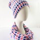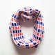 几何环形围巾的配色与几何的概念参考了:80年代的意大利memphis design团队,他们的室内设计与家具设计作品给了设计师丰富的灵感,制作成了此款毛帽与环形围巾。