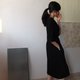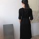 A slip-on-and-go black dress that features pinch detailing on the v-neck, self-tie belt, seam pockets, and 1/2 sleeves. Not lined. Simple yet timeless.