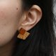 Hand-carved wooden earrings with square shaped acrylic crystal.