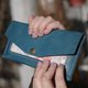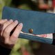 以植鞣革手染成最饱满的苹果红与普鲁士蓝,再搭配上浪漫的花布,小巧的手拿包,成了手掌上的美丽风景。