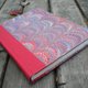 硬壳精致装订法,纯手工裁切、缝制、黏合,以 红色布质书衣 搭配 橙红X粉紫色的大理石纹纸(浮墨画/大理石浮纹水画)包覆封面硬壳,