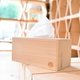 使用 0.3cm 日桧厚单打造,天然的木纹及年轮就是“无垢设计”的展现,有桧木香的抽取体验,适用于市售软包装抽取面纸。