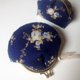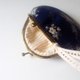 表布 深蓝玫瑰图样、里布 黄白线条、口金 亮金、蕾丝缎带随机。