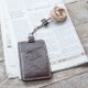 「简约典雅,细节会说话。整体结构为四层结构,接触皆为皮革细致表面。正面证件套透明片为活动式设计,长年使用可更换。」