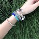 镂空纯银圆珠旁边加上了蓝色磷灰石点缀,配珠选了丹泉石跟海蓝宝。