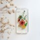 【1】手机壳是全透明包四边的软壳,手机壳表面会灌一层宝石胶把花材封起来,花材最终会相嵌在中央,所以不用担心会掉落问题。有些花朵比较厚或有重叠之处,有可能轻微凸起摸得到(例如:雏菊蕊/飞燕花蕊/满天星)