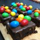 布朗尼加入花生一起烘烤,表面淋上牛奶巧克力,装饰彩色花生M&Ms,缤纷美味100分。