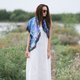 小建议:这个围巾很适合搭配白色的洋装,或是蓝色、紫蓝色、黑色与金色的衣物。