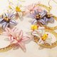 以丝线缠绕于造型片上制作而成-缠花;是台湾客家独特的“百年优美工艺”,以往用于婚嫁中,有分享幸福的吉祥语意,以细如发丝的线,透过细腻的缠绕功夫于造型片上,呈现出丝绸般的精致光泽。