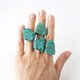 使用绿松石把每一颗不同形状的原石缠绕在戒台上,