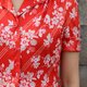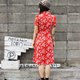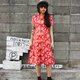 Description: (Vintage)正红色斜条纹小花朵布花排扣短袖古着洋装