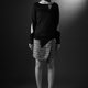 以特殊织纹毛呢布料设计出独特剪裁为主的合身短裙,腰头及背面以不同布料的不对称设计突显出此窄裙及布料的雅致。