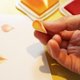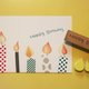 用纸胶带表现蜡烛的花样,再用两种烛光(水滴状)橡皮擦印章,印出蜡烛的烛火