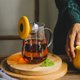 第四步:把滤茶球移动至杯顶,并当作杯盖使用,既可防止茶叶继续被浸泡,又能保存热茶的温度。
