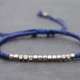 This is adjustable bracelet made with blue cotton waxed cord weaved together with cube shape silver beads . Closure using sliding knot