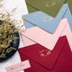 北欧进口厚度150g纸材制作的信封,特调色彩精致饱和,表面雾面无光泽带有微微纹路;空白可书写或烫印信息