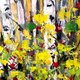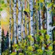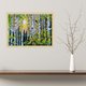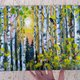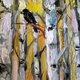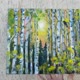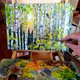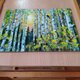 用画笔和调色刀画出风景如画的森林景观,上面有一只鸟。