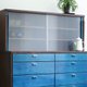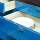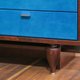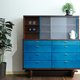 拉门的框架与抽屉的前板部分采用蓝色的上色方式,让柜子能作为客厅中的焦点,酝酿出整体高雅的存在感。此外,把手部分采用了一般家具不常使用的镜面金属银作为素材,在鲜艳的湛蓝背景下被衬托得更加耀眼。木头的素材则选用了桦木这种自古以来受到全世界爱戴的铭木,带有淡淡红褐色与清晰的木纹相当受到大家喜爱。由于这种特性,即使是施加了如此鲜明的涂装也能让木材透出隐约可见的木纹,呈现出素材本身的特有风貌。