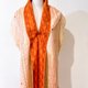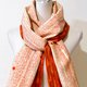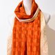 这件橘色的作品包含了两种不同材质,一是满版水彩笔触深浅的趣味;另一面则是以米白为底,手绘般虚虚实实的几何线条。两者相辅相成,既凸显了橘色的丰富色彩,也同时显现艺术与知性相融合的特色。围巾上闪耀的的乳白色的Swarovski烫钻让行动间闪耀光芒,犹如朝阳散发出一道道光芒。围巾的末端以大小不同的多切面水晶地球珠点缀,像叶子上的清晨露珠反射出阳光灿烂。