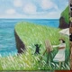 画作名称:女孩与黑猫在悬崖草地野花海边