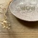 一个小盘子,上面有美国漫画风格字体的手工雕刻设计。