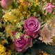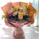这束花选用粉红色玫瑰及香槟色桔梗做主花,配衬轻柔的蕾丝花、浅粉色小菊、以及春天限定的黄相思,最后以油画风包装纸作结,温柔与优雅并重。在婚礼中用作答谢双方母亲的感谢花束最适合不过,够大气又得体。