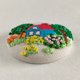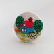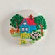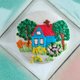 这是一款鲜艳的刺绣作品,描绘了有着醒目红屋顶的小屋以及庭院中盛开的树木与花朵。