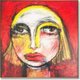 这幅画描绘了一位女性的抽象肖像,她有着一双炯炯有着神的大眼睛和一抹鲜艳的红唇。她脸部以鲜艳的黄色和白色为主色调,深红色的背景衬托出她深邃的目光。粗犷而富有动感的笔触和丰富的色彩组合赋予了作品一种原始而感性的特质,使人物显得既令人难以忘怀又令人着迷。