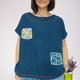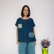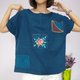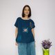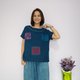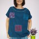 靛蓝色船领短袖衬衫,正面饰有独特的手工刺绣拼接。彩色线刺绣设计的细节很漂亮,海军蓝色衬衫上有出色的彩色拼布作品。