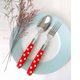 - 产品结合了食用级塑料的手柄及不锈钢的优点,让餐具同时拥有不锈钢的安全,以及树酯的轻巧与多变性,使用起来安全、轻巧,是款大人小孩都喜爱的系列。餐具手柄系使用双色射出制成、非印刷,图像不会褪色唷~