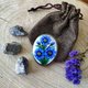 珍珠母贝底座为手绘矢车菊提供了迷人的背景,以其虹彩光泽增强了其魅力。蓝色与珍珠的对比营造出迷人的视觉效果,使这枚胸针真正引人注目。