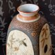 在酒瓶上运用五彩颜料以细描方式做绘图,瓶身四面绘有不同主题的植物花鸟;诗情画意,并穿搭少许金箔再上釉,这样的方式又称之为金襴手,有着华丽高贵的气息。另外可以发现瓶身带有美丽的开片,底部有"九谷造"字样,十分难能可贵!