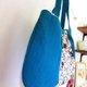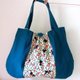 It is a soft fluffy cloth bag combining turquoise blue cotton linen close to sky blue, cotton fabric of cat and flower.